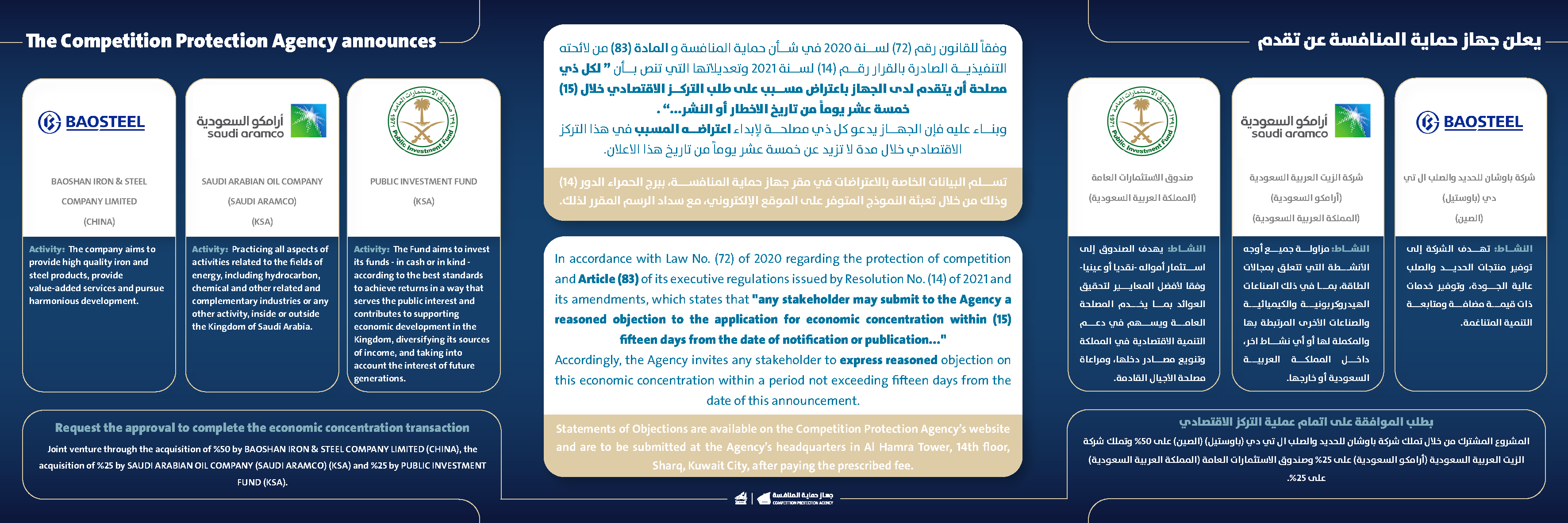 يعلن جهاز حماية المنافسة عن تقدم شركة باوشان للحديد والصلب ال تي دي (باوستيل) (الصين) وشركة الزيت العربية السعودية (ارامكو السعودية) (السعودية) و صندوق الاستثمارات العامة (المملكة العربية السعودية) بطلب الموافقة على اتمام عملية التركز الاقتصادي