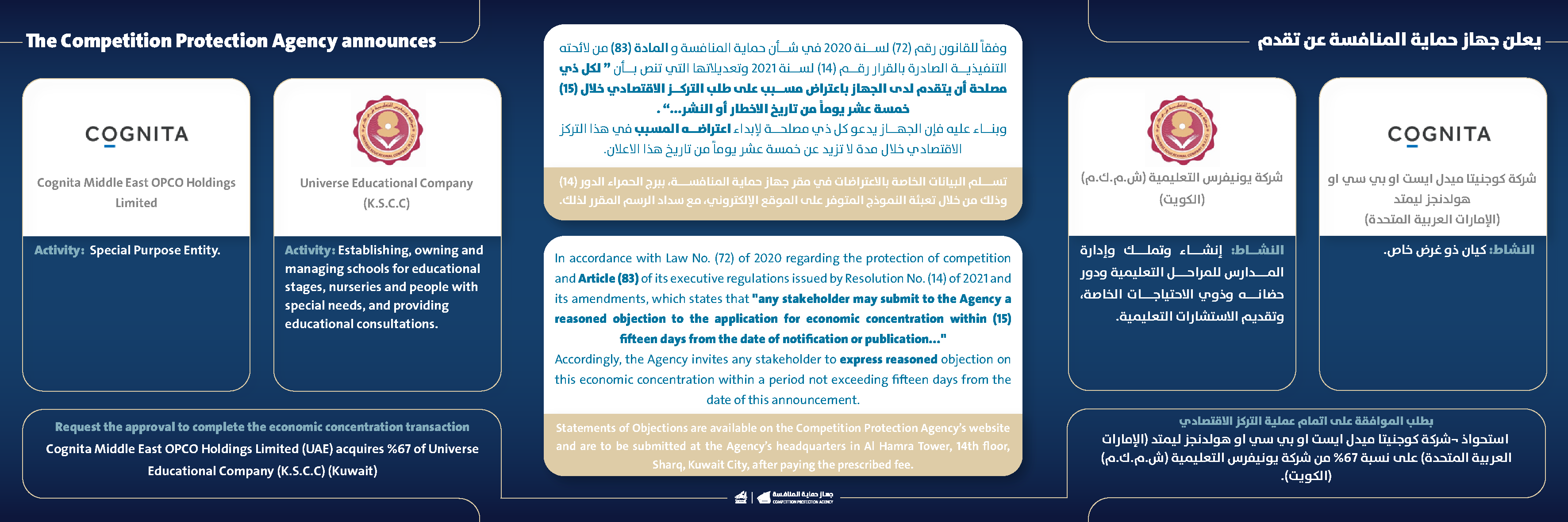يعلن جهاز حماية المنافسة عن تقدم شركة كوجنيتا ميدل ايست او بي سي او هولدنجز ليمتد(الإمارات العربية المتحدة) وشركة يونيفرس التعليمية (ش.م.ك.م)(الكويت) بطلب الموافقة على اتمام عملية التركز الاقتصادي