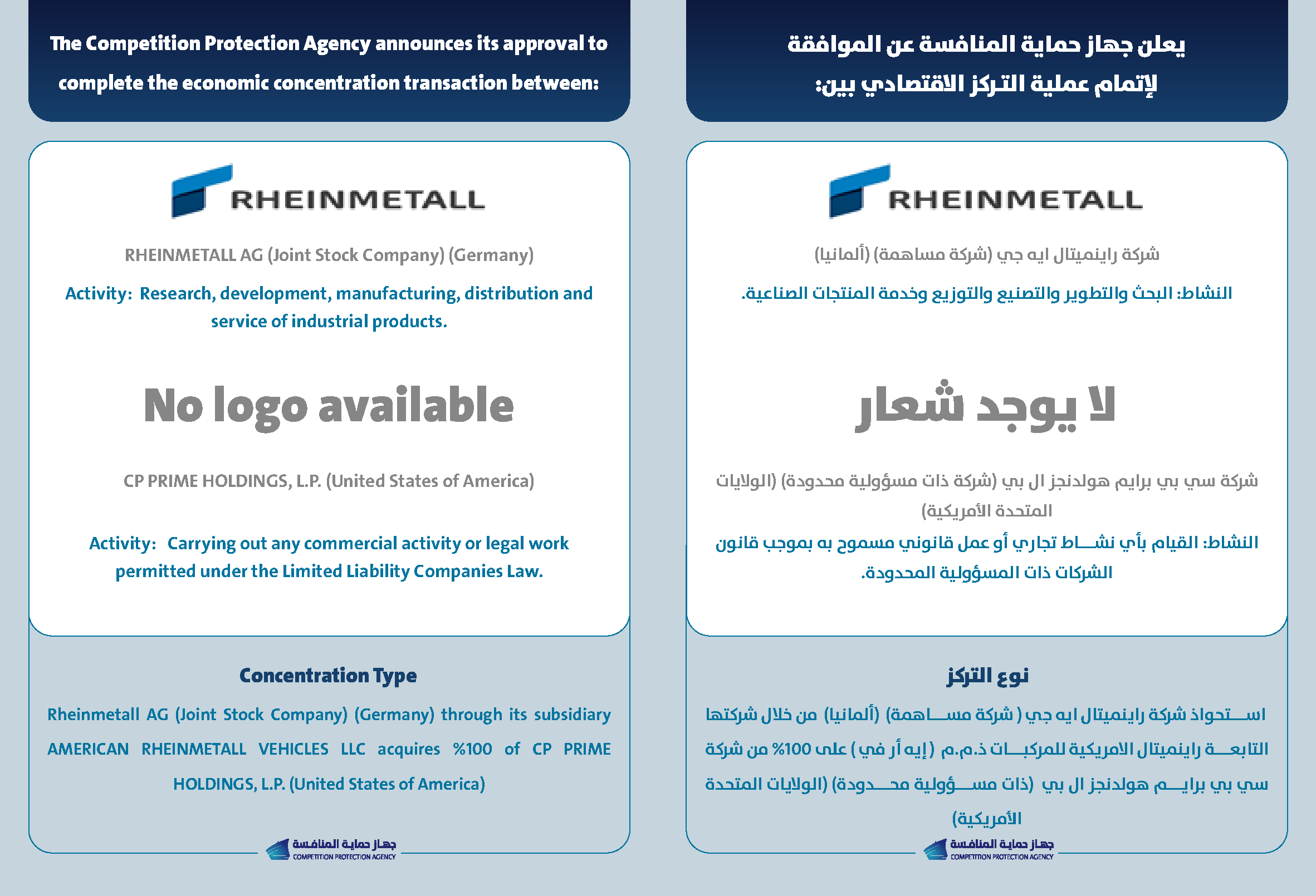 يعلن جهاز حماية المنافسة عن الموافقة لإتمام عملية التركز الاقتصادي بين شركة راينميتال ايه جي (شركة مساهمة) (ألمانيا) وشركة سي بي برايم هولدنجز ال بي (شركة ذات مسئوولية محدودة) (الولايات المتحدة الامريكية)