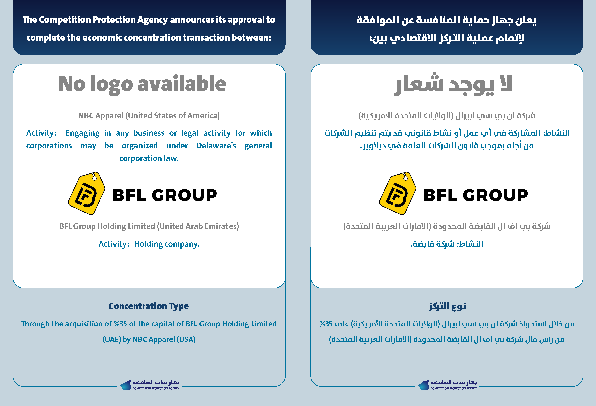 يعلن جهاز حماية المنافسة عن الموافقة لإتمام عملية التركز الاقتصادي بين شركة ان بي سي ابيرال (الولايات المتحدة الامريكية) وشركة بي اف ال القابضة المحدودة (الامارات العربية المتحدة)