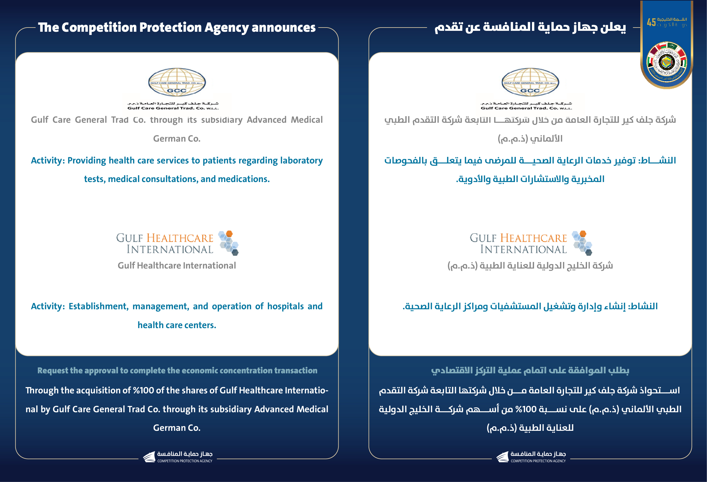 يعلن جهاز حماية المنافسة عن تقدم شركة جلف كير للتجارة العامة من خلال شركتها التابعة شركة التقدم الطبي الألماني (ذ.م.م) وشركة الخليج الدولية للعناية الطبية (ذ.م.م) بطلب الموافقة على اتمام عملية التركز الاقتصادي.