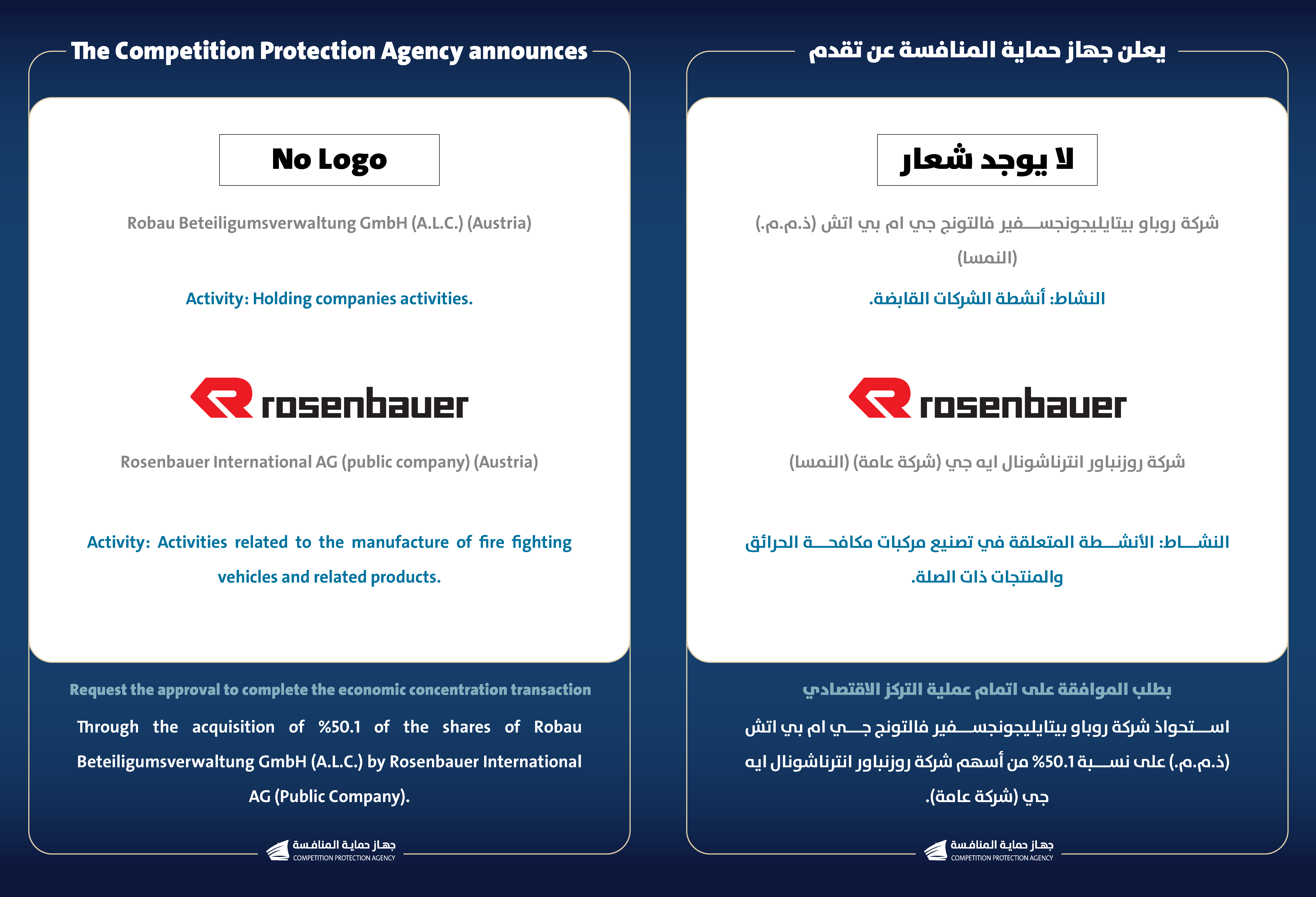 يعلن جهاز حماية المنافسة عن تقدم شركة روباو بيتا يليجو نجسفير فالتونج جي ام بي اتش (ذم.م) (النمسا) وشركة روزنباور انترناشونال ايه جي (شركة عامة) (النمسا) بطلب الموافقة على اتمام عملية التركز الاقتصادي.