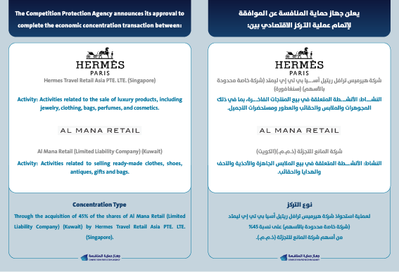 يعلن جهاز حماية المنافسة عن الموافقة لإتمام عملية التركز الاقتصادي بين شركة هيرميس ترافل ريتيل آسيا بي تي إي ليمتد (شركة خاصة محدودة بالأسهم) (سنغافورة) وشركة المانع للتجزئة (ذم.م.) (الكويت).