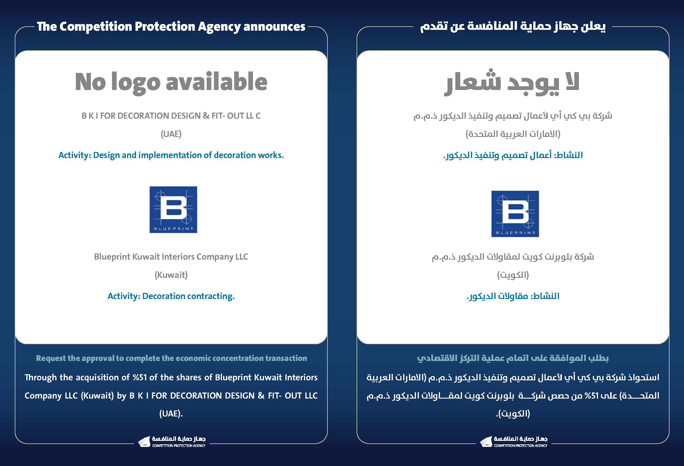 يعلن جهاز حماية المنافسة عن تقدم شركة بي كي أي لأعمال تصميم وتنفيذ الديكور ذ.م.م (الامارات العربية المتحدة) وشركة بلو برنت كويت لمقاولات الديكور ذ.م.م (الكويت) بطلب الموافقة على اتمام عملية التركز الاقتصادي.
