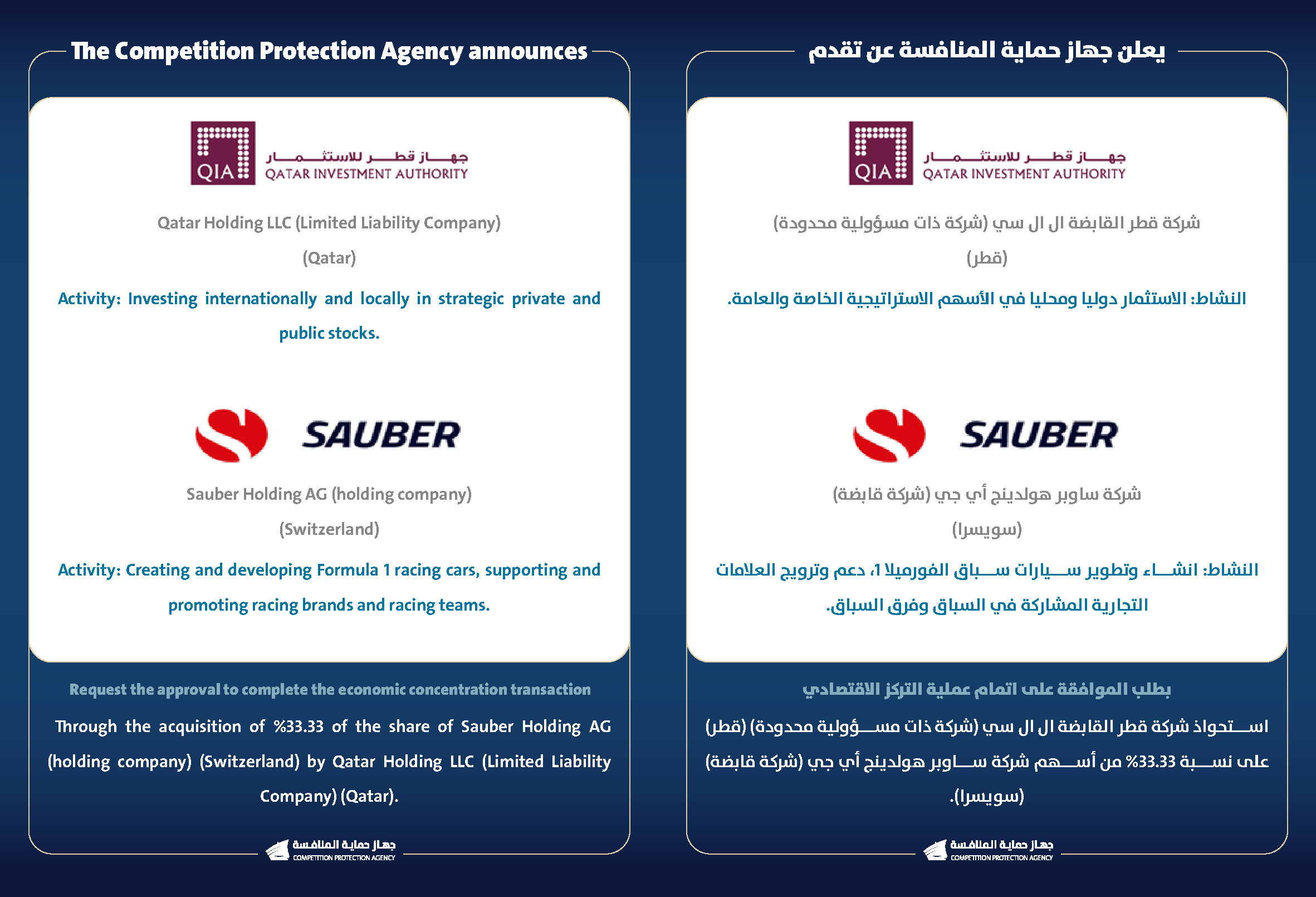 يعلن جهاز حماية المنافسة عن تقدم شركة قطر القابضة ال ال سي (شركة ذات مسؤولية محدودة) (قطر) وشركة ساوبر هولدينج أي جي (شركة قابضة) (سويسرا) بطلب الموافقة على اتمام عملية التركز الاقتصادي.