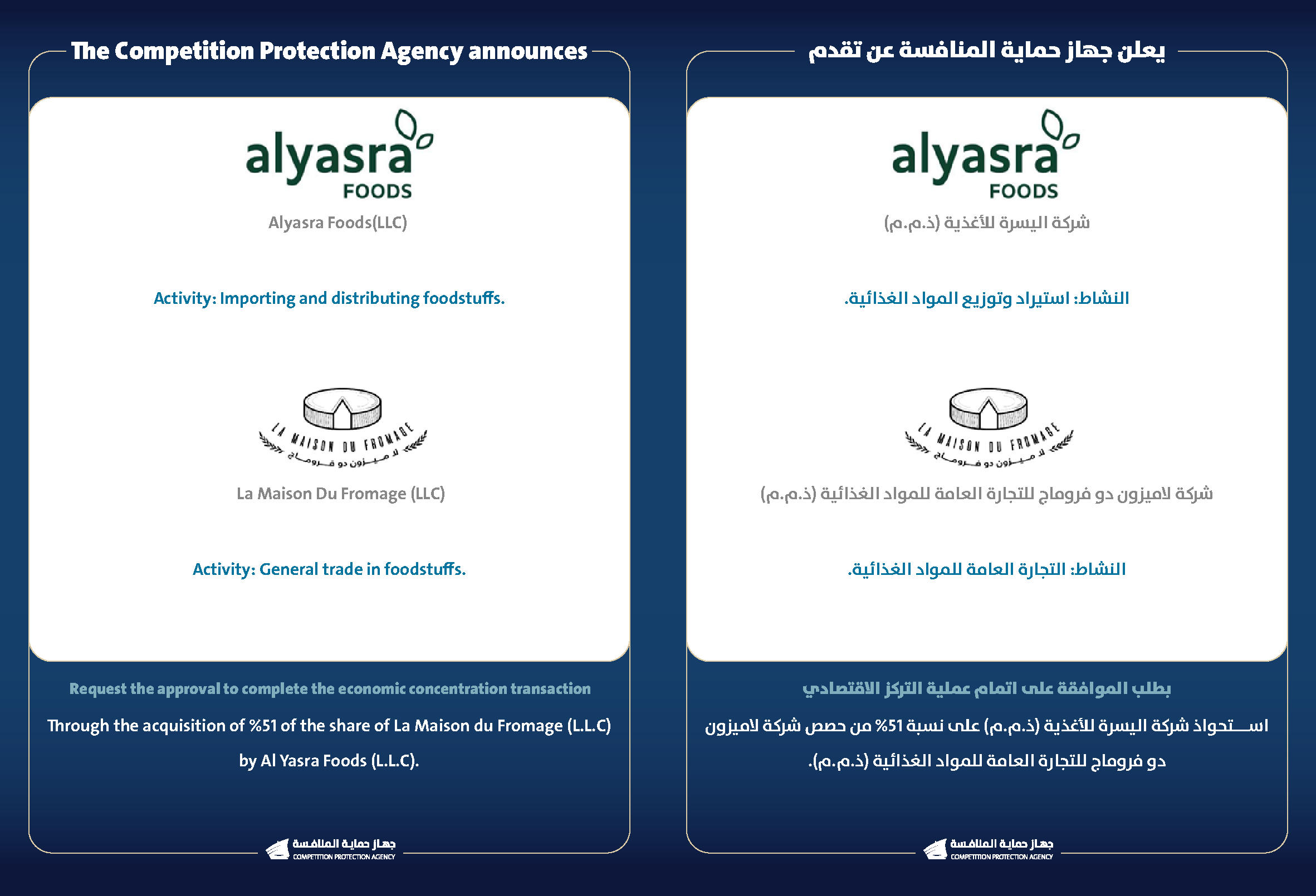 يعلن جهاز حماية المنافسة عن تقدم شركة اليسرة للأغذية (ذ.م.م) وشركة لاميزون دو فروماج للتجارة العامة للمواد الغذائية (ذ.م.م) بطلب الموافقة على اتمام عملية التركز الاقتصادي.