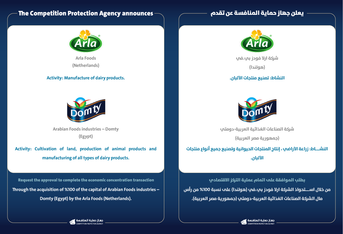 يعلن جهاز حماية المنافسة عن تقدم شركة ارلا فودز بي. في (هولندا) وشركة الصناعات الغذائية العربية - دومتي (جمهورية مصر العربية) بطلب الموافقة على اتمام عملية التركز الاقتصادي