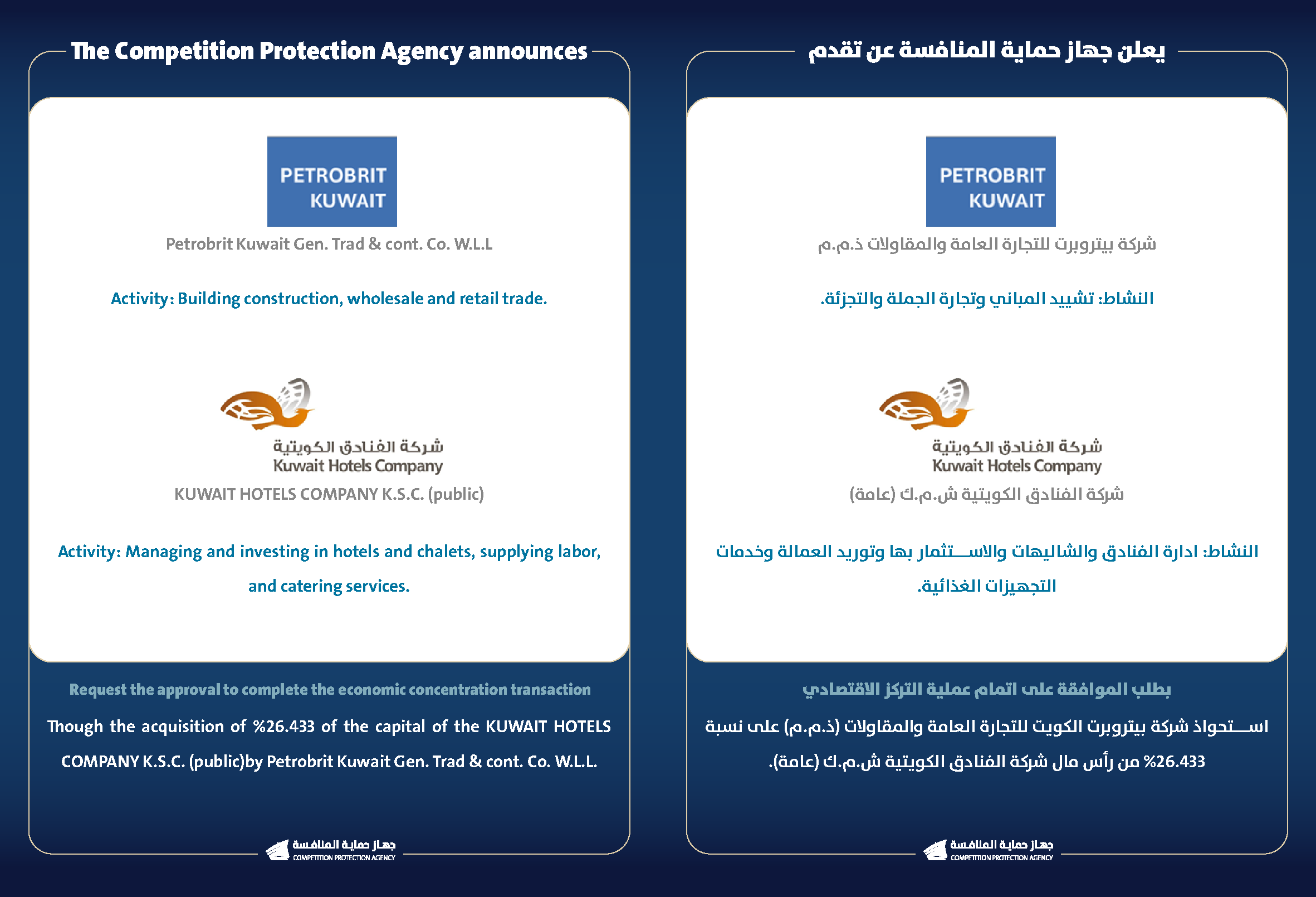 يعلن جهاز حماية المنافسة عن تقدم شركة بيتروبرت للتجارة العامة والمقاولات ذ.م.م وشركة الفنادق الكويتية ش.م.ك (عامة) بطلب الموافقة على اتمام عملية التركز الاقتصادي.