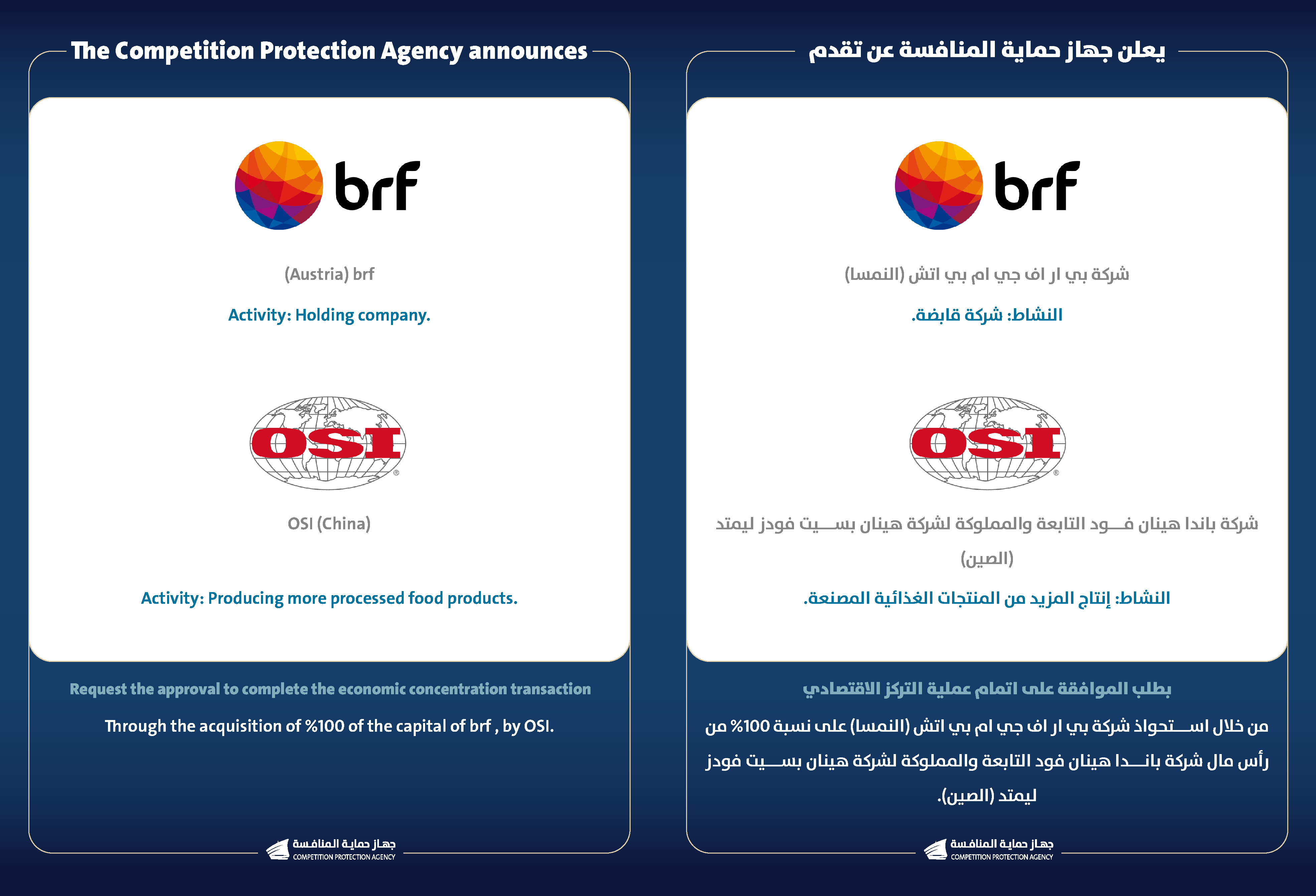 يعلن جهاز حماية المنافسة عن تقدم شركة بي ار اف جي ام بي اتش (النمسا) وشركة باندا هينان فود التابعة والمملوكة لشركة هينان بسيت فودز ليمتد (الصين) بطلب الموافقة على اتمام عملية التركز الاقتصادي.