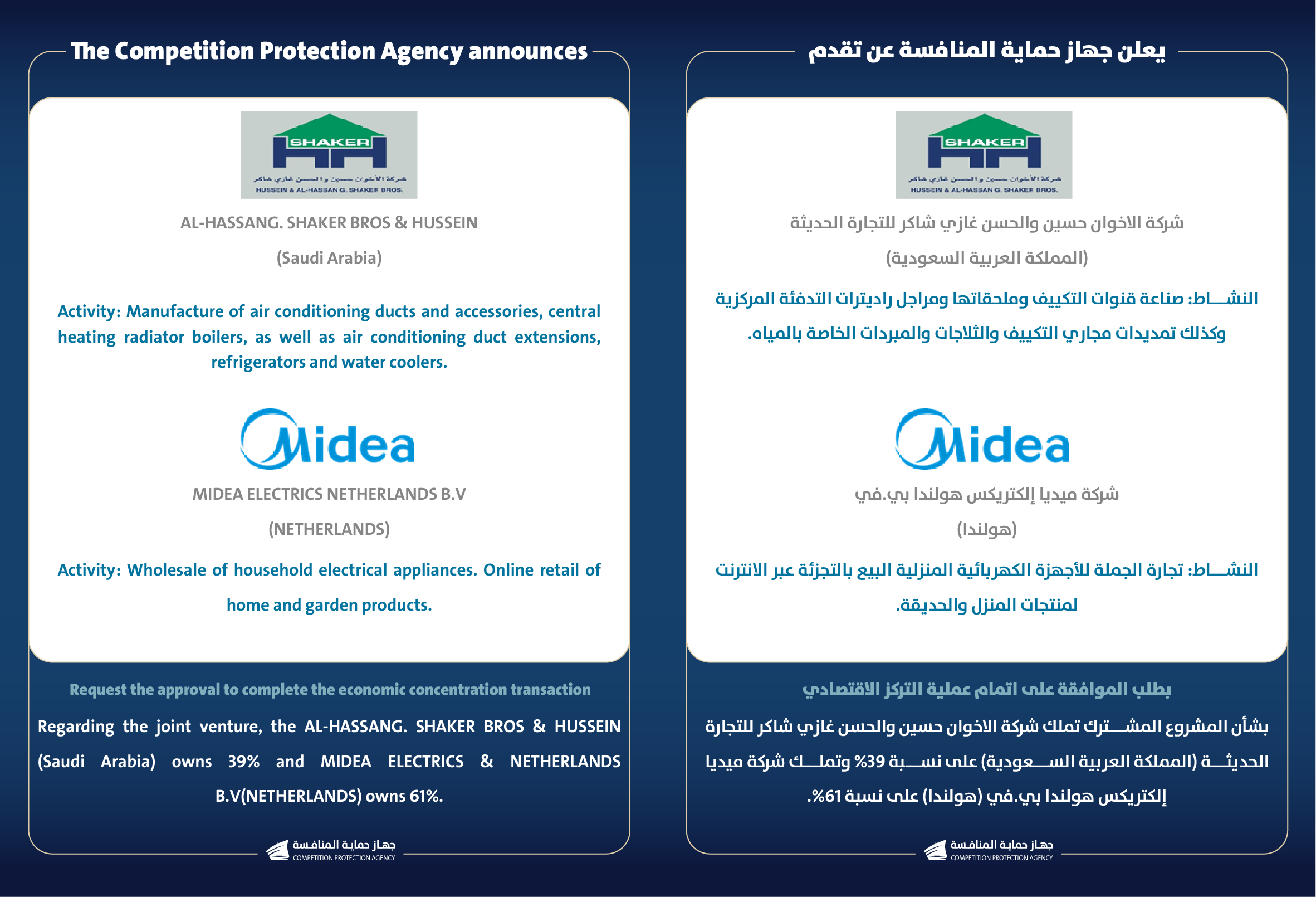 يعلن جهاز حماية المنافسة عن تقدم شركة الاخوان حسين والحسن غازي شاكر للتجارة الحديثة (المملكة العربيه السعودية) و شركة ميديا إليكتريكس هولندا بي .في (هولندا) بطلب الموافقة على اتمام عملية التركز الاقتصادي