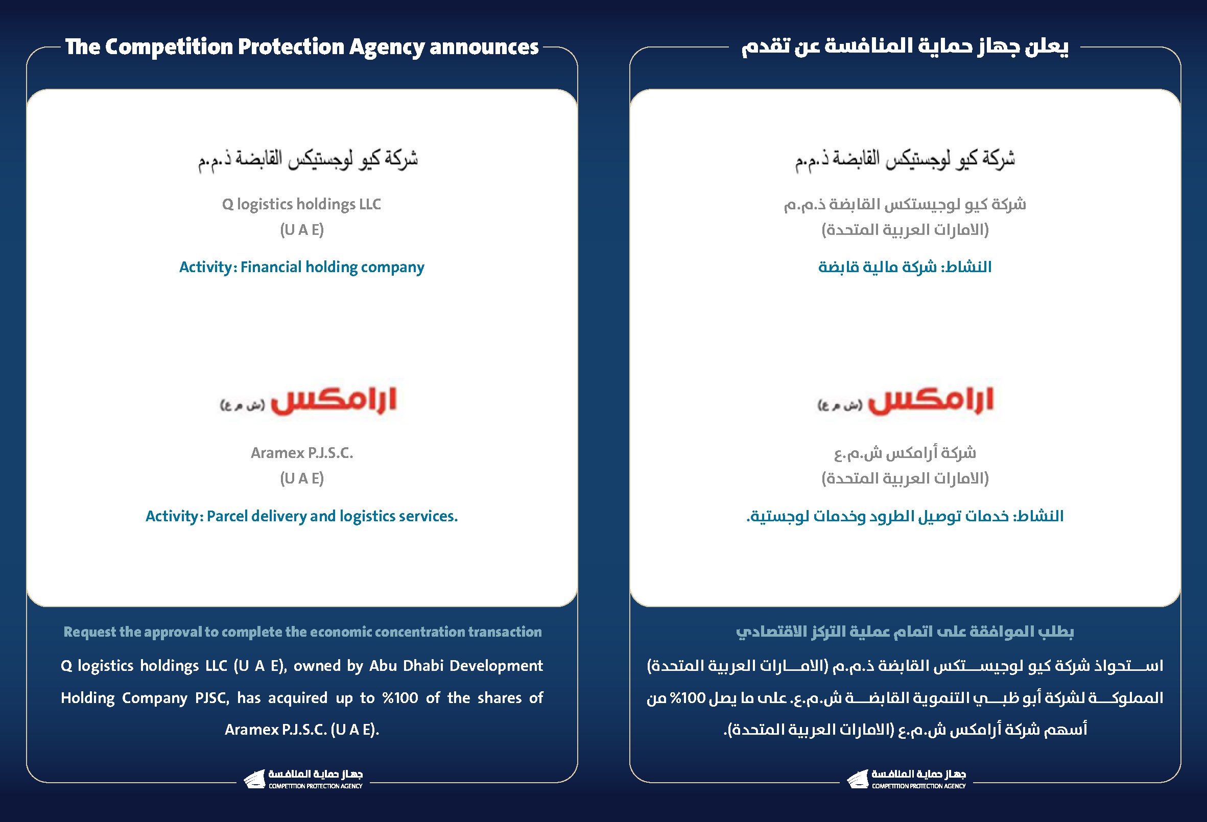يعلن جهاز حماية المنافسة عن تقدم شركة كيو لوجيستكس القابضة ذ.م.م (الامارات العربية المتحدة) وشركة أرامكس ش.م.ع (الامارات العربية المتحدة) بطلب الموافقة على اتمام عملية التركز الاقتصادي.