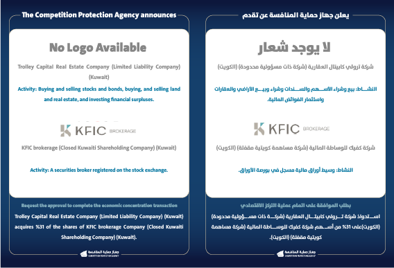 يعلن جهاز حماية المنافسة عن تقدم شركة ترولي كابيتال العقاريM (شركة ذات مسئولية محدودة) (الكويت) وشركة كفيك للوساطة المالية (شركة مساهمة كويتية مقفلة) (الكويت) بطلب الموافقة على اتمام عملية التركز الاقتصادي.