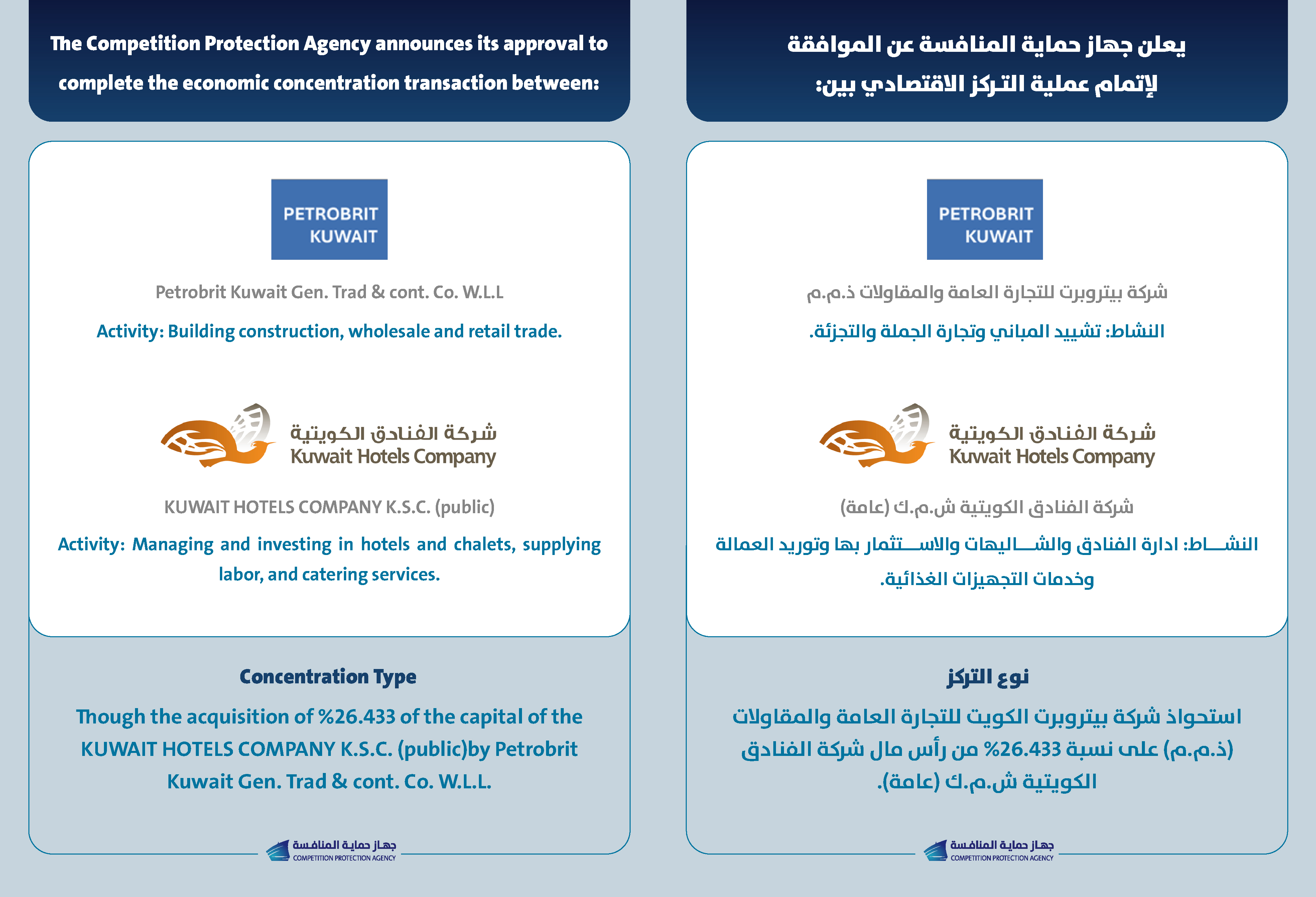 يعلن جهاز حماية المنافسة على الموافقة لإتمام عملية التركز الاقتصادي بين شركة بتروبرنت للتجارة العامة والمقاولات ذ.م.م وشركة الفنادق الكويتية ش.م.ك(عامة)