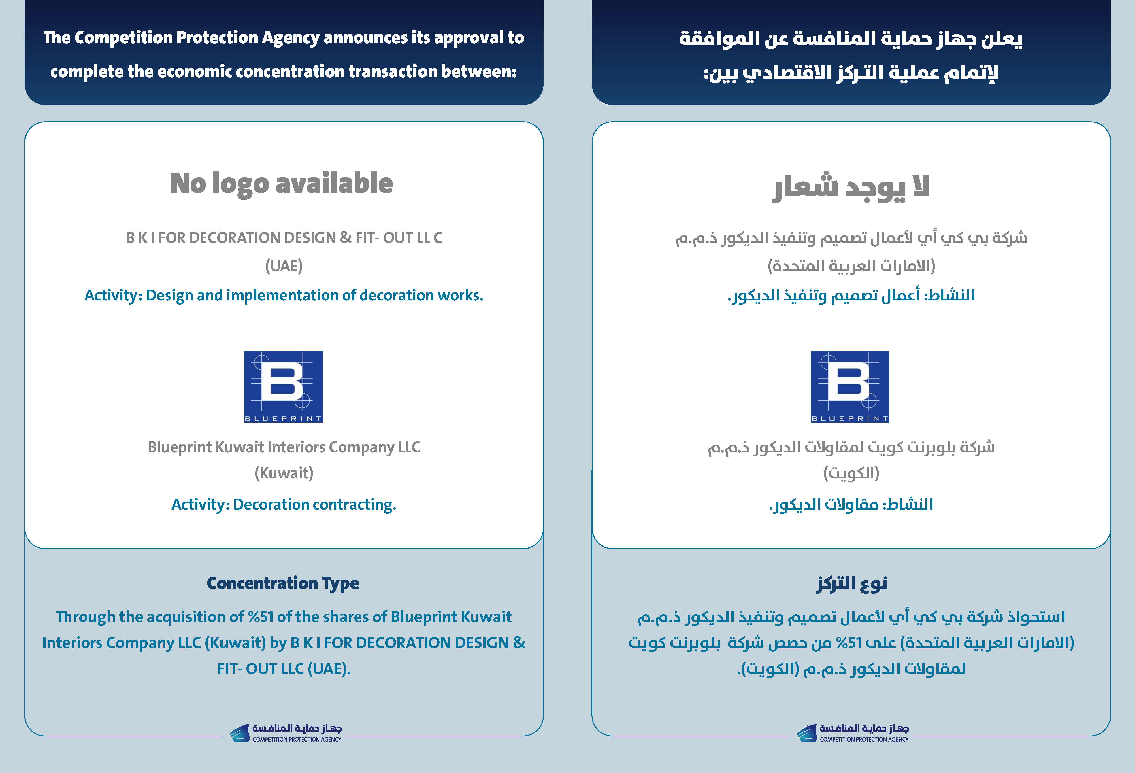 يعلن جهاز حماية المنافسة على الموافقة لإتمام عملية التركز الاقتصادي بين شركة بي كي أي لأعمال تصميم وتنفيذ الديكور ذ.م.م(الامارات العربية المتحدة) وشركة بلوبرنت كويت لمقاولات الديكور ذ.م.م(الكويت).