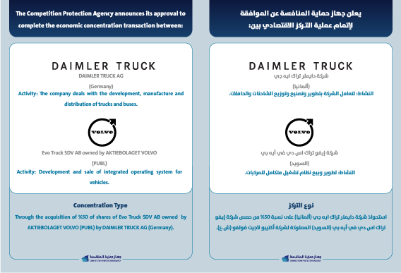 يعلن جهاز حماية المنافسة على الموافقة لإتمام عملية التركز الاقتصادي بين شركة دايملر تراك ايه جي (ألمانيا) وشركة إيفو تراك اس دي في أيه بي (السويد).