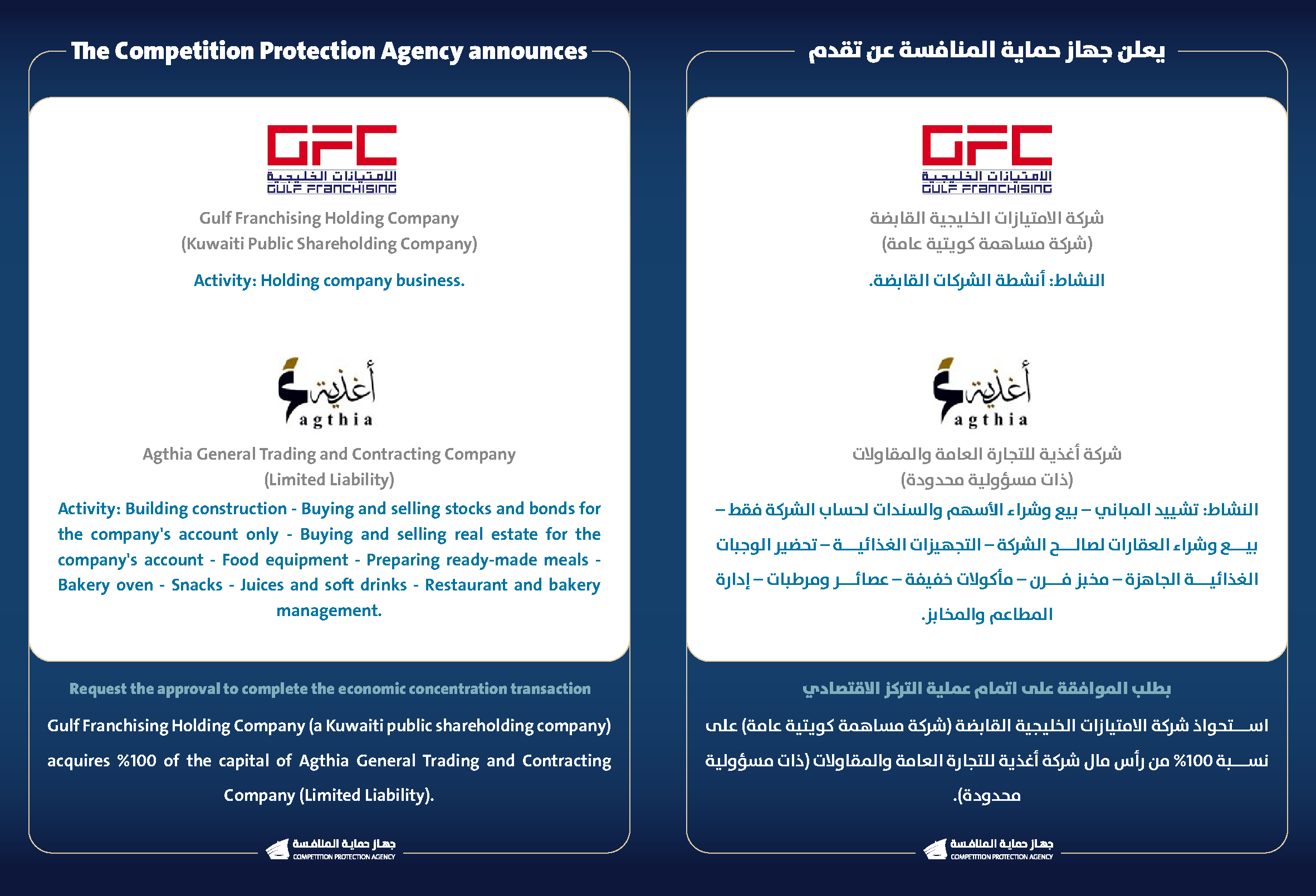 يعلن جهاز حماية المنافسة عن تقدم شركة الامتيازات الخليجية القابضة (شركة مساهمة كويتية عامة) وشركة أغذية للتجارة العامة والمقاولات (ذات مسؤولية محدودة) بطلب الموافقة على اتمام عملية التركز الاقتصادي.