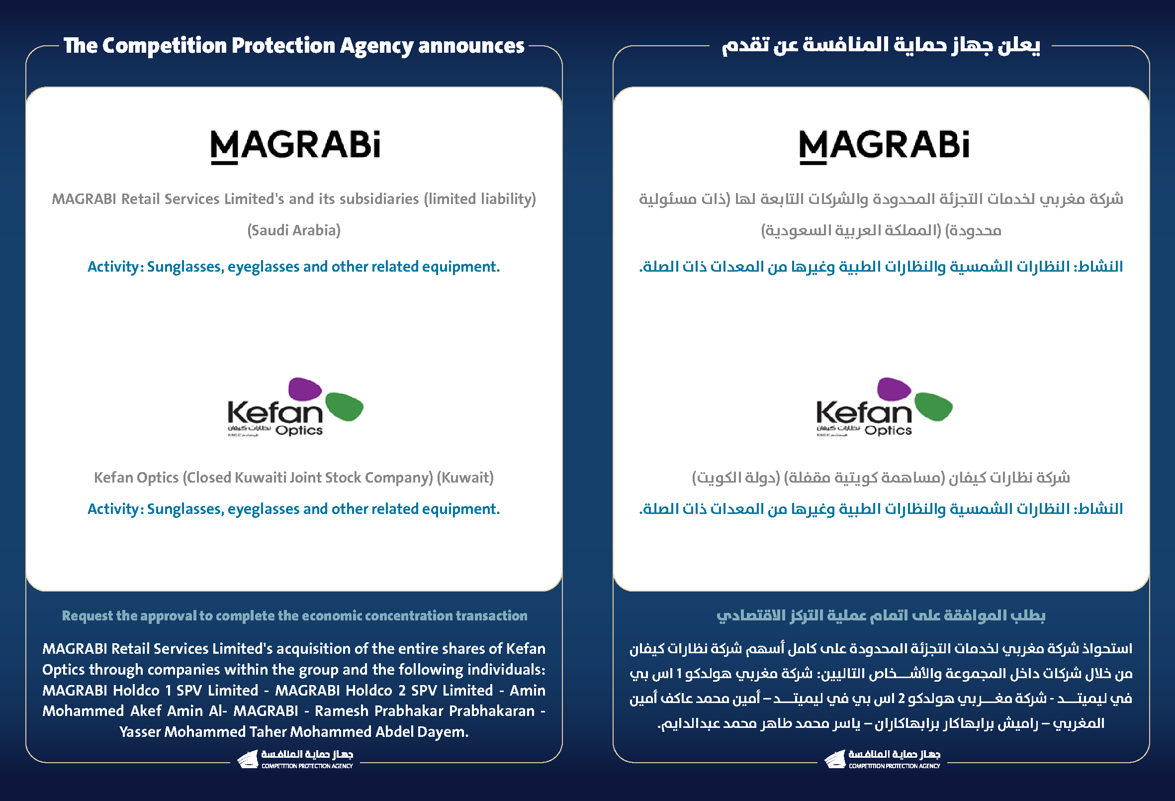 تقدم شركة مغربي لخدمات التجزئة المحدودة والشركات التابعة لها(ذات مسئولية محدودة ) (المملكة العربية السعودية)وشركة نظارات كيفان (مساهمة كويتية مقفلة) (دولة الكويت) بطلب الموافقة على اتمام عملية التركز الاقتصادي.