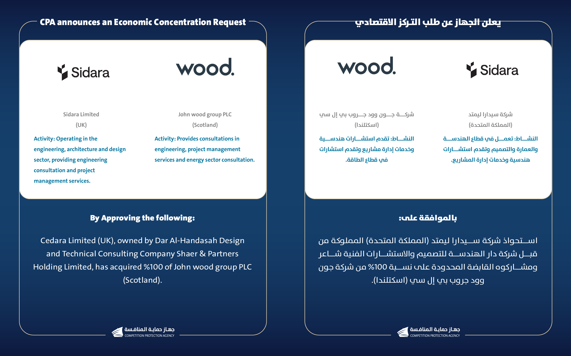 تقدم شركة سيدارا ليمتد (المملكة المتحدة) وشركة جون وود جروب بي إل سي (اسكتلندا) بطلب الموافقة على اتمام عملية التركز الاقتصادي.