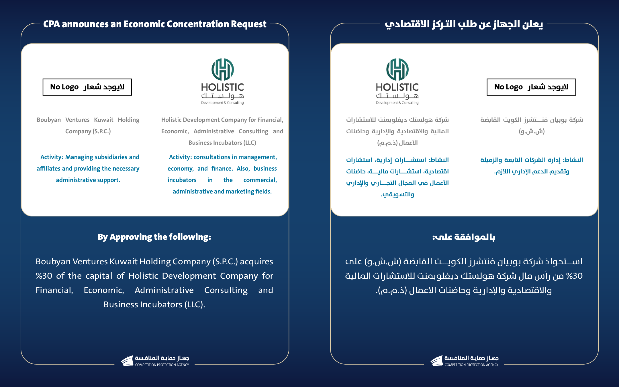 تقدم شركة بوبيان فنتشرز الكويت القابضة (ش.ش.و) وشركة هولستك ديفلوبمنت للاستشارات المالية والاقتصادية والإدارية وحاضنات الاعمال (ذ.م.م) بطلب الموافقة على اتمام عملية التركز الاقتصادي.