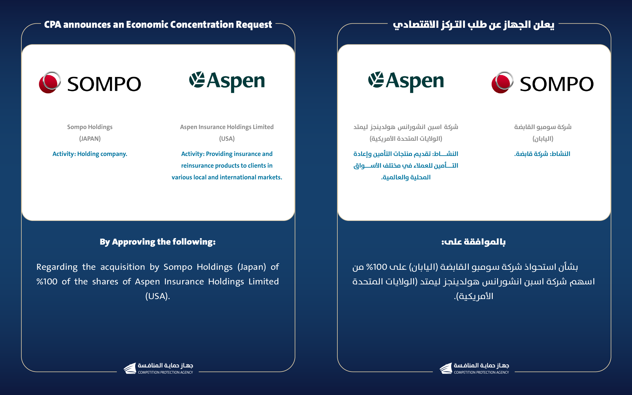 شركة سومبو القابضة (اليابان) وشركة اسبن انشورانس هولدينجز ليمتد (الولايات المتحدة الأمريكية) بطلب الموافقة على اتمام عملية التركز الاقتصادي.