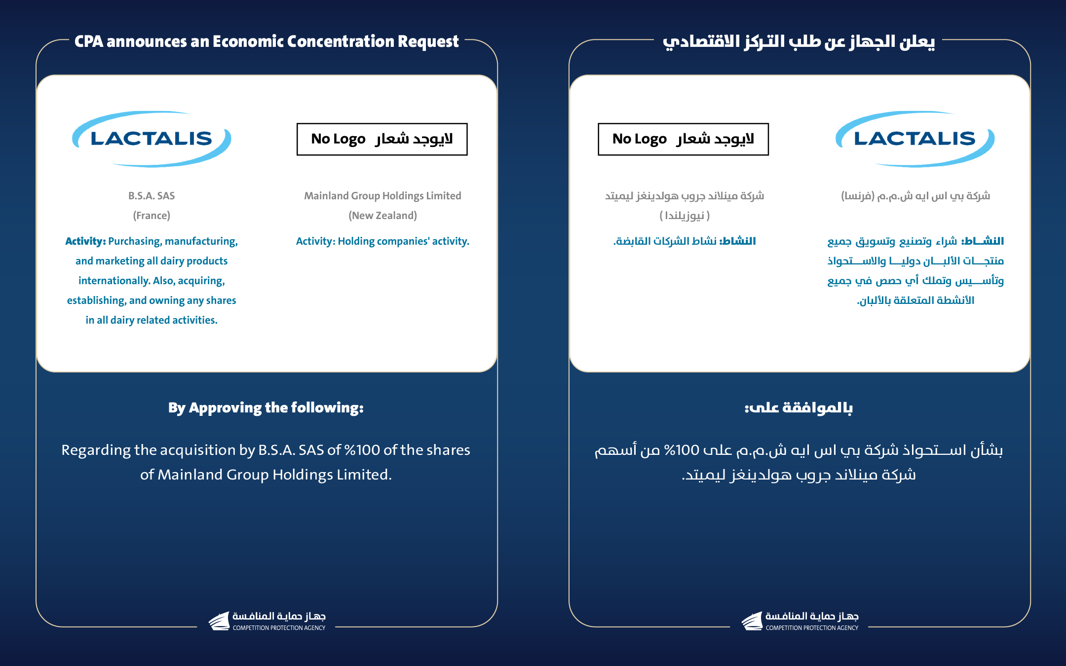 تقدم شركة بي اس ايه ش.م.م (فرنسا) وشركة مينلاند جروب هولدينغز ليميتد (نيوزيلندا) بطلب الموافقة على اتمام عملية التركز الاقتصادي.