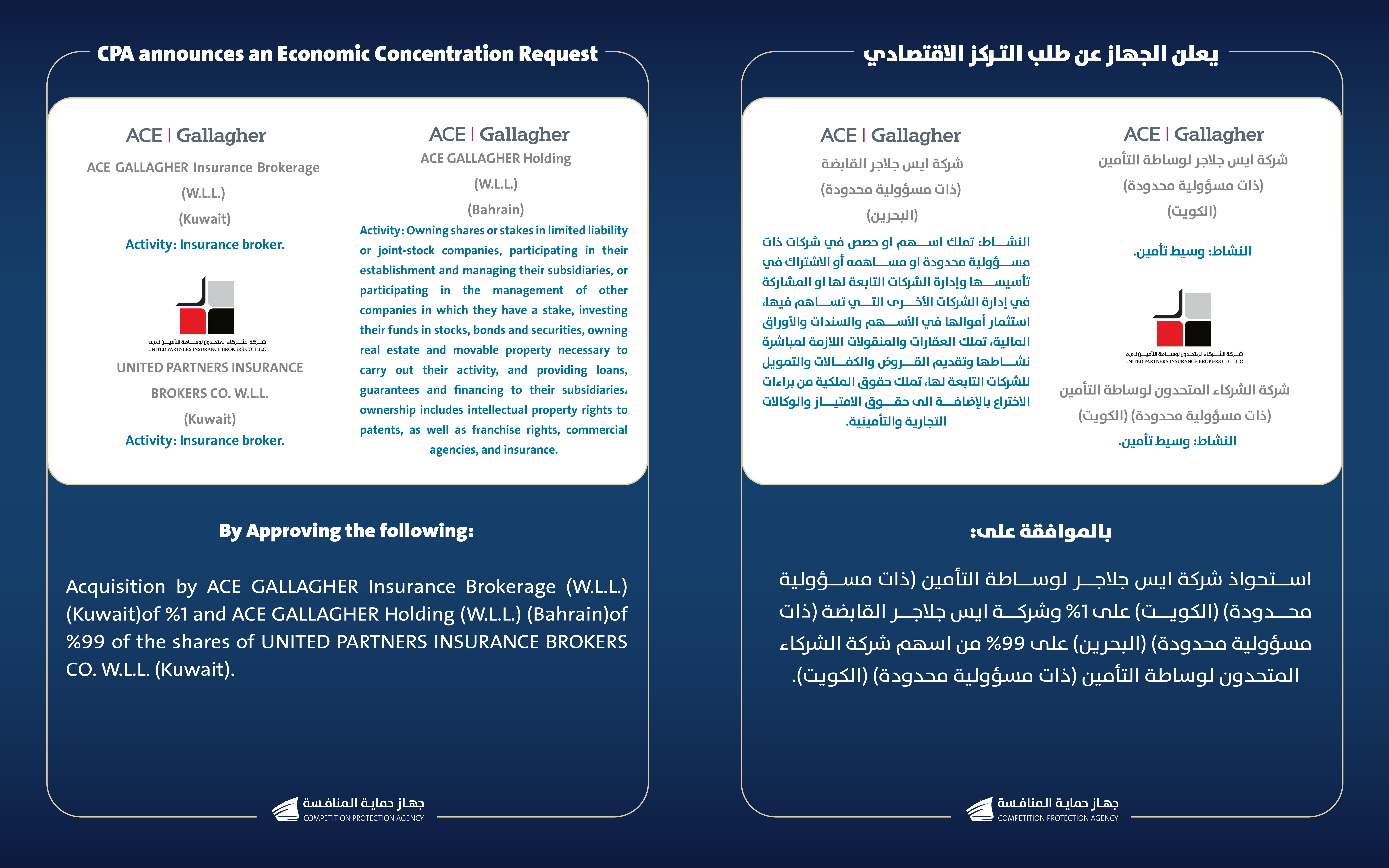 تقدم شركة ايس جلاجر لوساطة التأمين (ذات مسؤولية محدودة) (الكويت) وشركة ايس جلاجر القابضة (ذات مسؤولية محدودة) (البحرين) وشركة الشركاء المتحدون لوساطة التأمين (ذات مسؤولية محدودة) (الكويت) بطلب الموافقة على اتمام عملية التركز الاقتصادي.