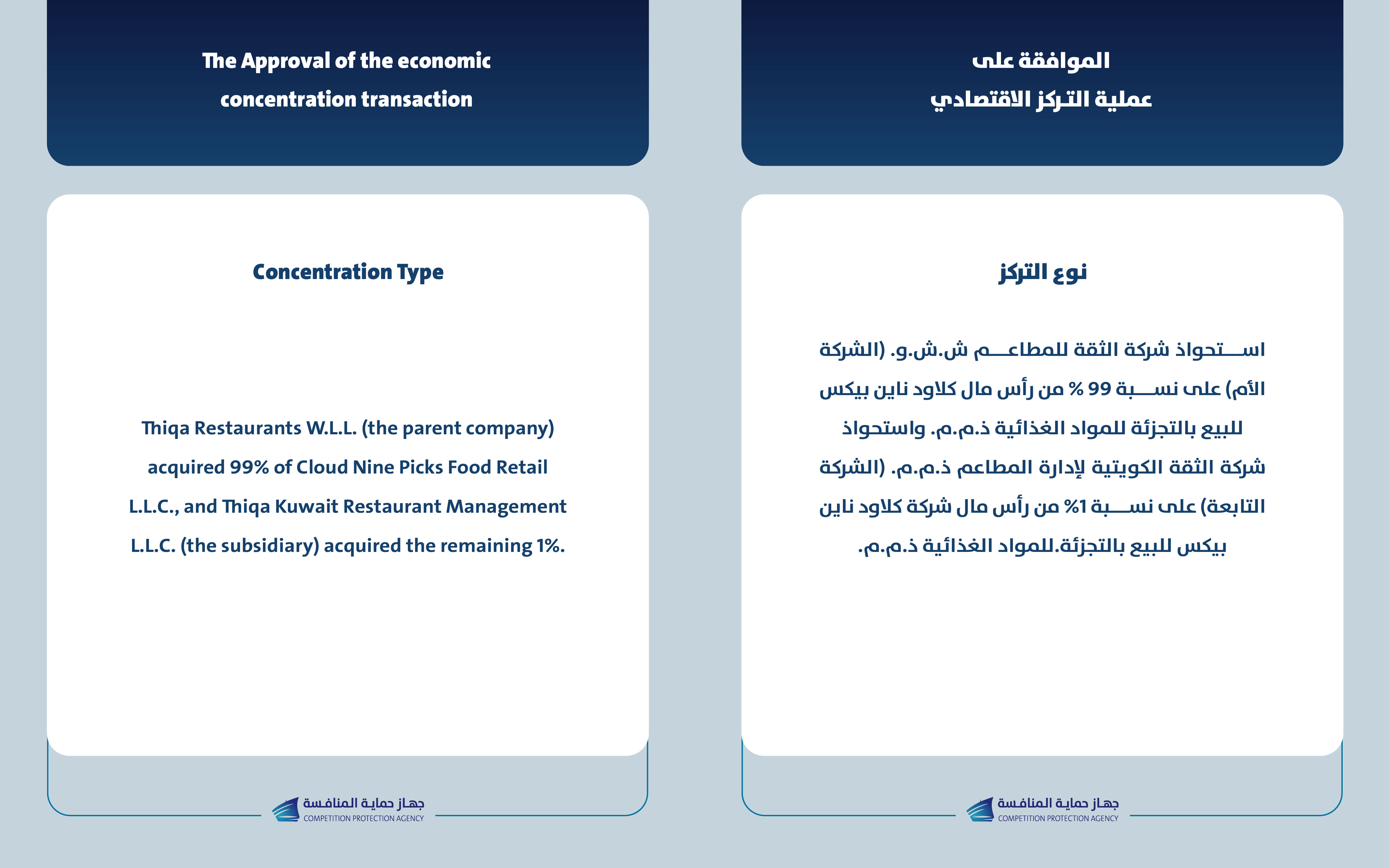 يعلن جهاز حماية المنافسة عن الموافقة لإتمام عملية التركز الاقتصادي بين شركة الثقة للمطاعم ش.ش.و (دولة الكويت) وشركة الثقة الكويتية لإدارة المطاعم ذ.م.م (دولة الكويت) وشركة كلاود ناين بيكس للبيع بالتجزئة للمواد الغذائية (دولة الكويت).