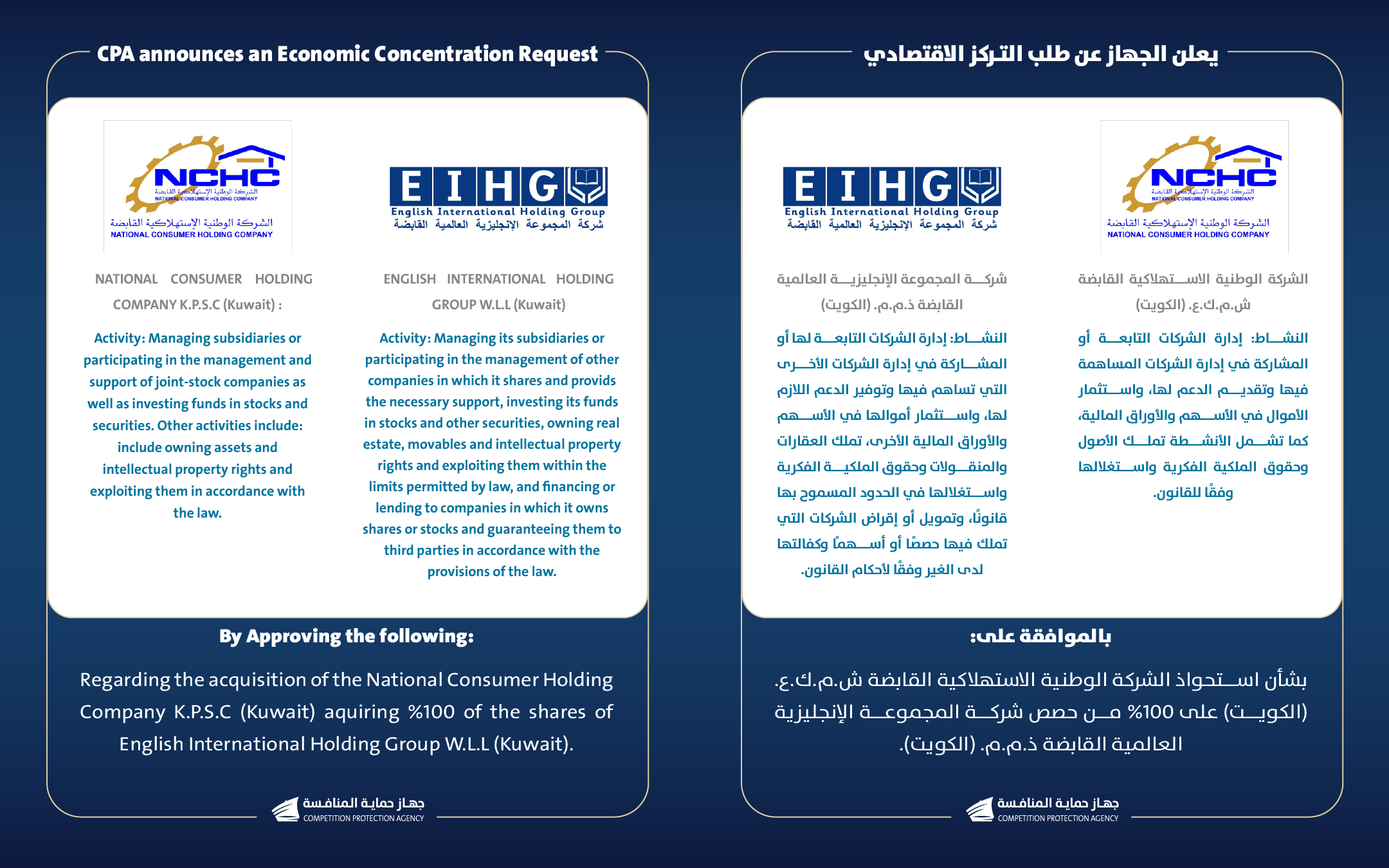 يعلن جهاز حماية المنافسة عن تقدم الشركة الوطنية الاستهلاكية القابضة ش.م.ك.ع. (الكويت) وشركة المجموعة الإنجليزية العالمية القابضة ذ.م.م.(الكويت( بطلب الموافقة على اتمام عملية التركز الاقتصادي.