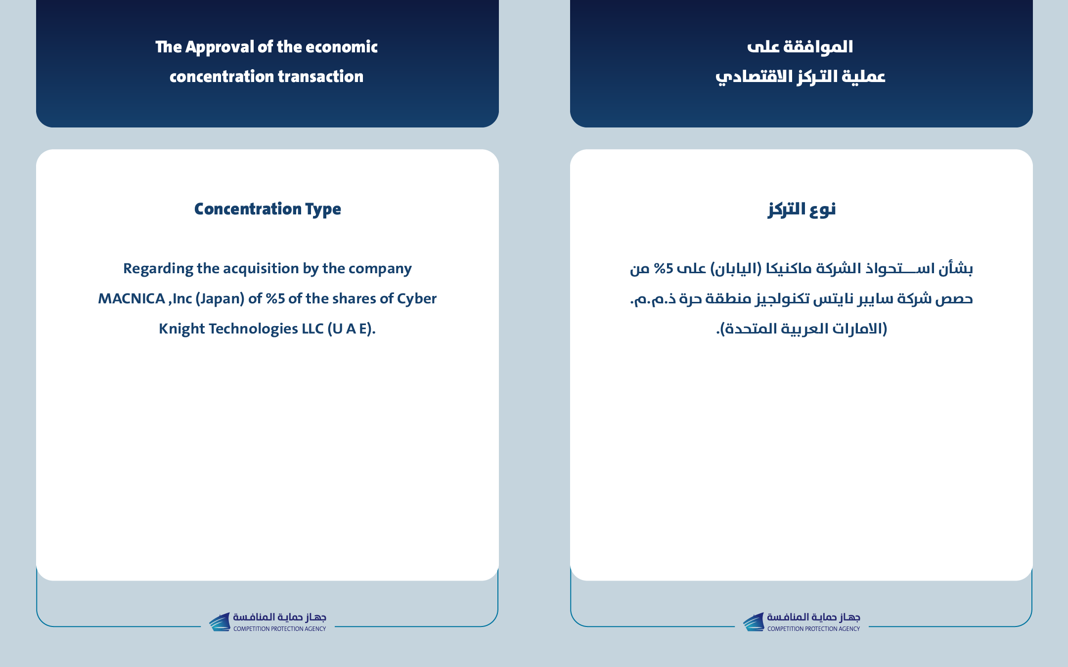 الموافقة على عملية التركز الاقتصادي بين شركة ماكنيكا (اليابان) وشركة سايبر نايتس تكنولجيز منطقة حرة ذ.م.م. (الامارات العربية المتحدة).